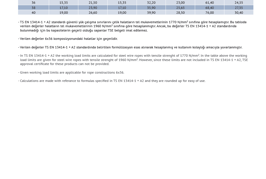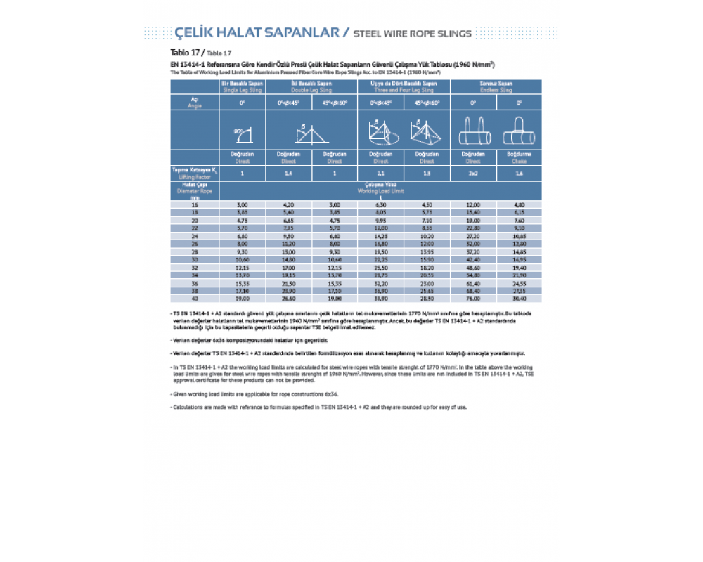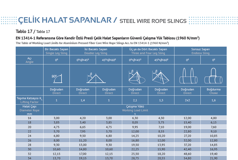 KENDİR ÖZLÜ PRESLİ ÇELİK HALAT SAPANLAR / 1960 N/mm / EN 13414-1 REFERANSINA GÖRE