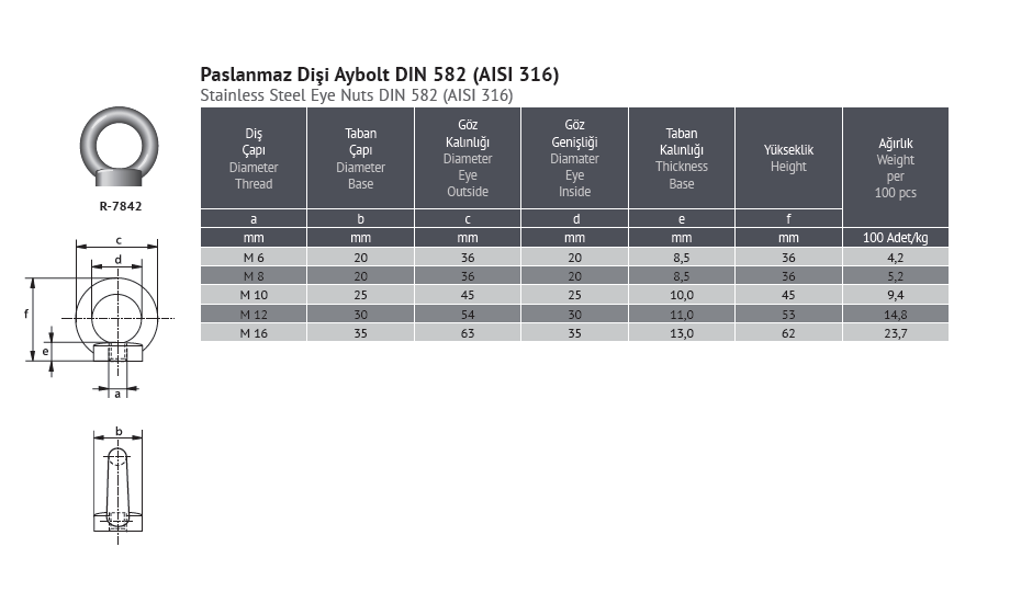 PASLANMAZ DİŞİ AYBOLT DIN 582 (AISI 316) / R-7842
