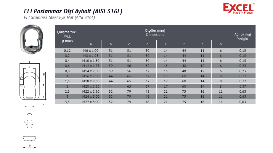 PASLANMAZ DİŞİ AYBOLT - ELI (AISI 316L)